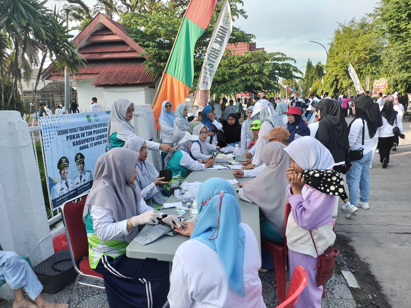 Luwu Utara,ambarnews.com — Dalam rangka memeriahkan Hari Ulang Tahun (HUT) ke-26 Kabupaten Luwu Utara, Tim Penggerak PKK (TP-PKK) Kabupaten Luwu Utara, melalui Pokja IV, menggelar skrining Penyakit Tidak Menular (PTM) terhadap peserta jalan santai, Ahad (27/4/2025).