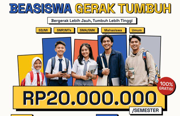 Gerak Tumbuh Indonesia meluncurkan Beasiswa Gerak Tumbuh 2026, program bantuan pendidikan hingga Rp20.000.000 per semester yang terbuka untuk semua jenjang, dari SD hingga S2, tanpa syarat IPK, prestasi, domisili, atau usia. Program ini juga mencakup pelatihan karier, sertifikasi internasional, dan kesempatan magang industri. Pendaftaran dibuka mulai 1 April 2026.
