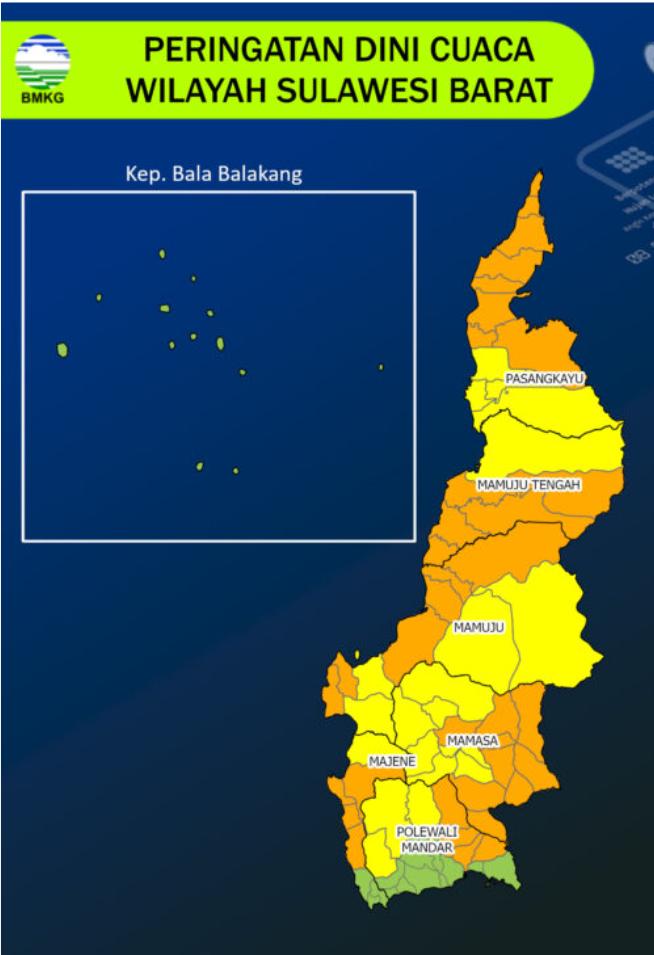 Berpotensi hujan ringan di wilayah Kabupaten Mamasa (Tabulahan, Tanduk Kalua, Balla, Buntumalangka), Kabupaten Mamuju (Kalukku, Kalumpang, Papalang, Tommo, Bonehau), Kabupaten Mamuju Tengah (Tobadak, Topoyo), dan Kabupaten Pasangkayu (Baras).