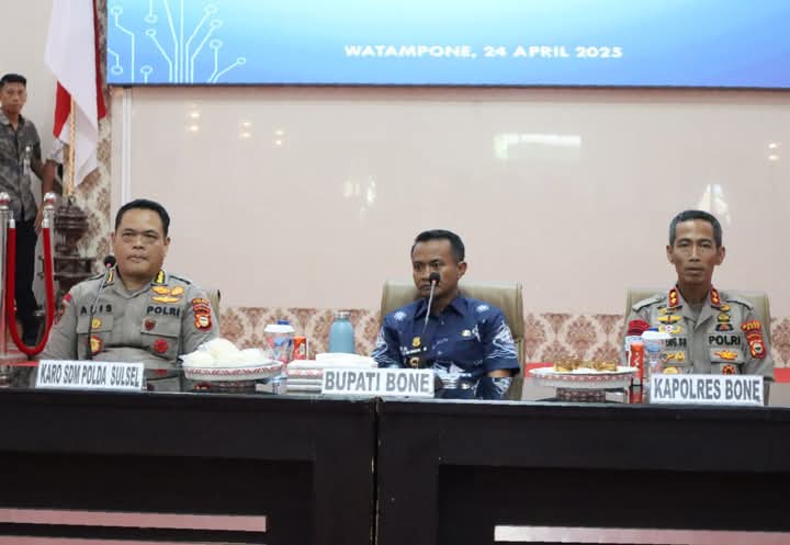 Rapat koordinasi tersebut digelar di Aula Lateya Riduni, Watampone, dan dihadiri oleh Kapolres Bone AKBP Sugeng Setio Budhi, S.I.K., M.Tr.Opsla., bersama para pejabat utama Polres Bone, para Kapolsek jajaran, serta seluruh Kepala Organisasi Perangkat Daerah (OPD) di lingkup Pemerintah Kabupaten Bone.