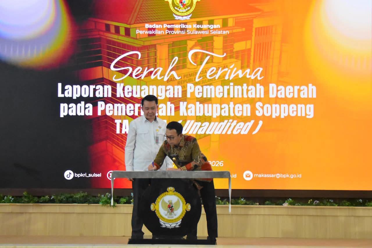 SOPPENG—AMBARNEWS.COM || Pemerintah Kabupaten Soppeng menyerahkan Laporan Keuangan Pemerintah Daerah (LKPD) unaudited Tahun Anggaran 2025 kepada Badan Pemeriksa Keuangan (BPK) RI Perwakilan Provinsi Sulawesi Selatan.
