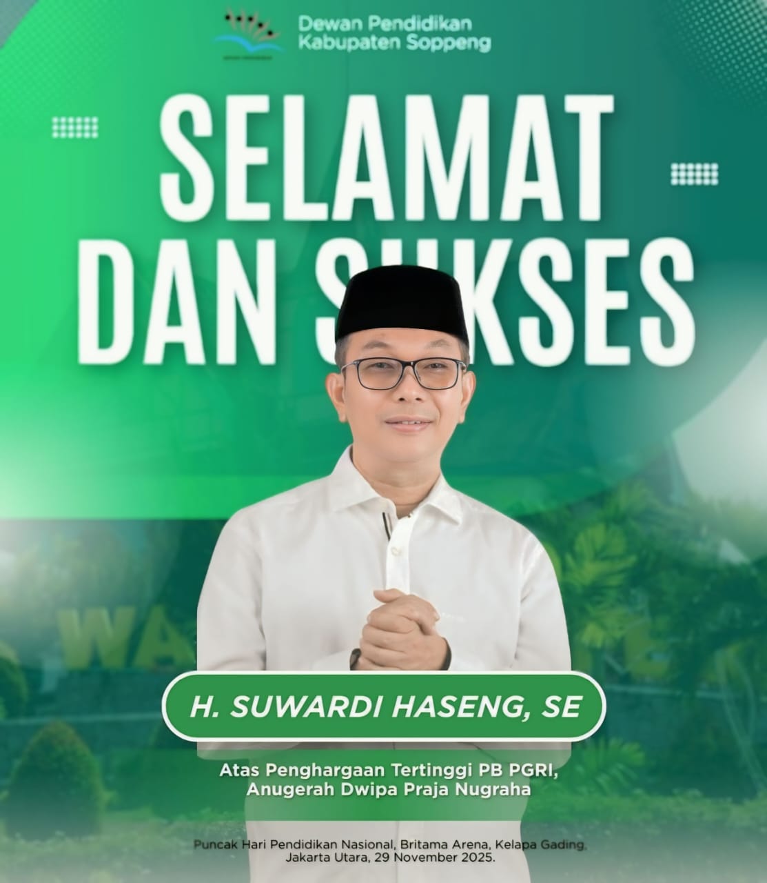 SOPPENG-AMBARNEWS.COM || Momen Hari Guru Nasional 2025 menjadi sangat istimewa bagi Kabupaten Soppeng. Bupati Soppeng, H. Suwardi Haseng, SE, dianugerahi penghargaan tertinggi dari Persatuan Guru Republik Indonesia (PGRI), yaitu Dwija Praja Nugraha.