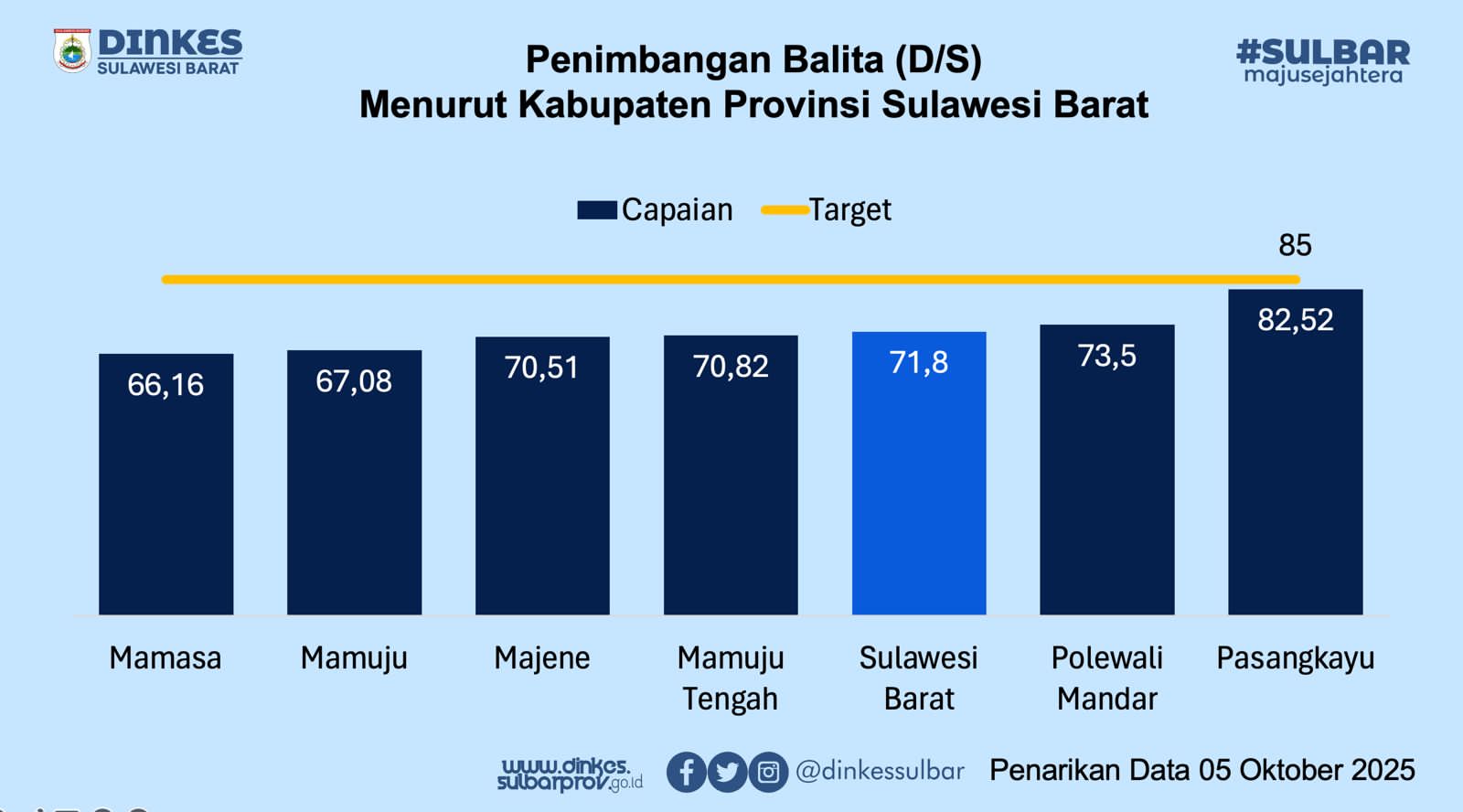 Mamuju ambarnews.com – Upaya peningkatan penimbangan balita di Sulawesi Barat menunjukkan hasil positif. Berdasarkan data per 5 Oktober 2025, capaian penimbangan balita (D/S) Provinsi Sulawesi Barat telah mencapai 71,8 Persen, dengan Kabupaten Pasangkayu mencatatkan capaian tertinggi 82,52 Persen dan Mamasa masih perlu penguatan dengan capaian 66,16 Persen.