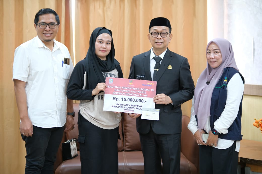Penyerahan santunan dilaksanakan pada Rabu, 21 Mei 2025 bertempat di Kantor Bupati Soppeng. Santunan diserahkan langsung oleh Bupati Soppeng, H. Suwardi Haseng, SE, kepada ahli waris korban, Merianti, selaku orang tua dari almarhumah Fakhira Firsana Merta, yang meninggal dunia akibat musibah banjir.