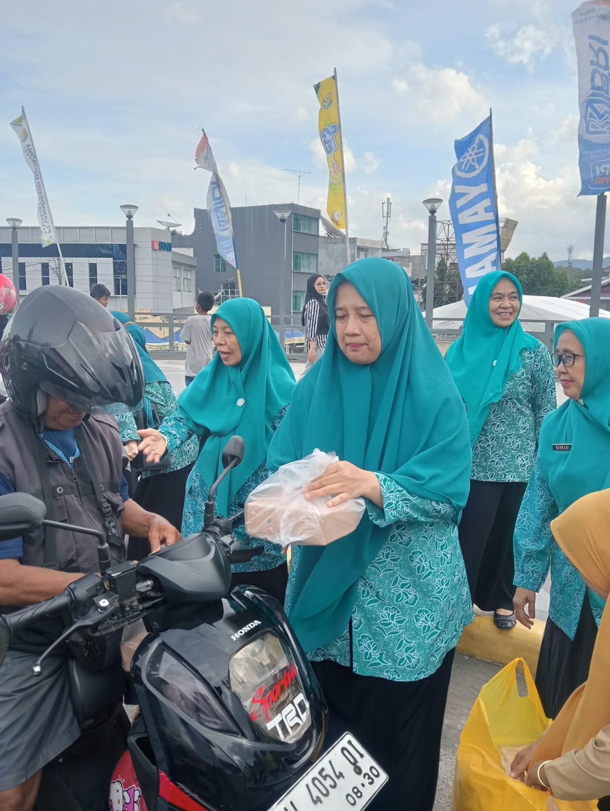 Hj Suarni Suwardi tampak turun langsung ke jalan membagikan takjil sembari menyapa masyarakat dengan ramah. Kehadirannya di tengah warga menjadi simbol kedekatan dan kepedulian organisasi terhadap masyarakat.