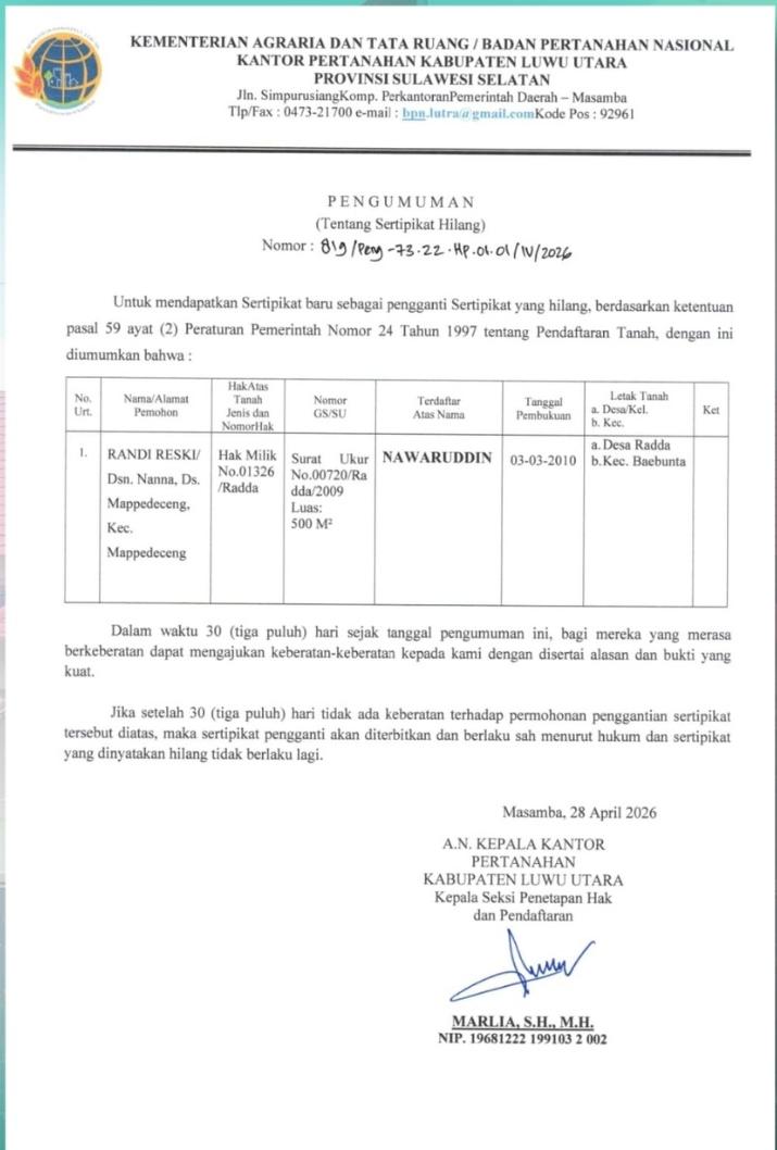 LUWU UTARA–AMBARNEWS.COM || Dalam upaya menjamin kepastian hukum atas hak kepemilikan tanah serta menjaga tertib administrasi pertanahan, Kantor Pertanahan Kabupaten Luwu Utara mengumumkan adanya sertifikat hak atas tanah yang dinyatakan hilang, Selasa (28/4/2026).
