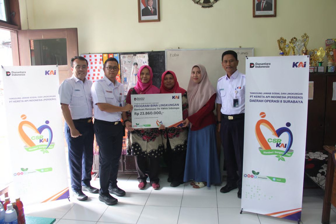 Kali ini, KAI Daop 8 Surabaya memberikan bantuan Corporate Social Responsibility (CSR) renovasi sekolah kepada TK Yayasan Wanita Kereta Api (YWKA), yang berlokasi di Jl. Sidotopo Lor No. 12, Sidotopo, Kec. Semampir, Surabaya, guna menciptakan lingkungan belajar yang lebih nyaman dan aman bagi para murid.