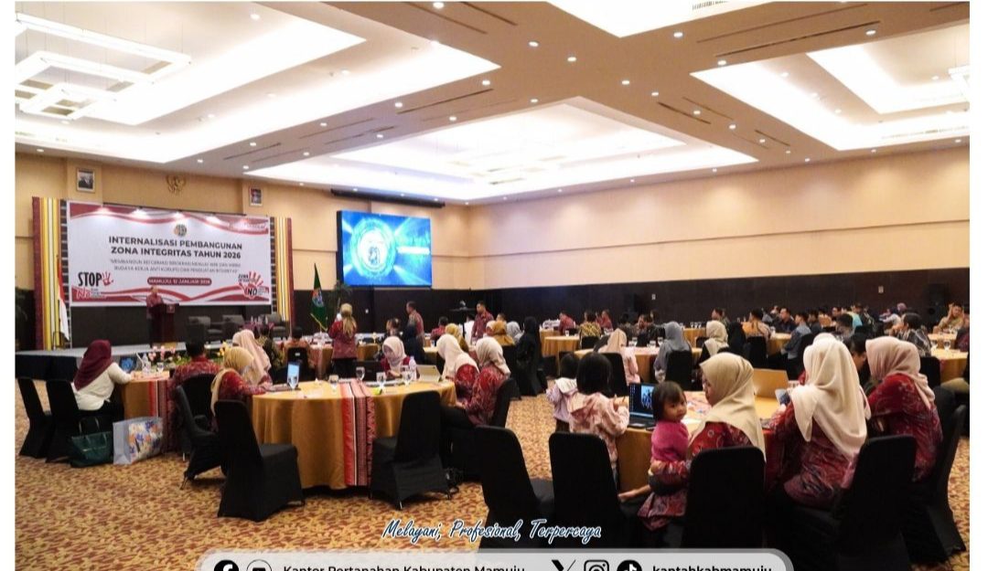 Mamuju. ambarnews.com–Kantor Pertanahan Kabupaten Mamuju mengikuti Rapat Internalisasi Pembangunan Zona Integritas Tahun 2026 bertema “Membangun Reformasi Birokrasi Menuju WBK dan WBBM: Budaya Kerja Anti Korupsi dan Penguatan Integritas” di Ballroom Grand Maleo Hotel & Convention Mamuju. Kegiatan ini dibuka oleh Kakanwil BPN Sulbar, Budi Kristiyana, yang menekankan pentingnya peningkatan kinerja satuan kerja serta pengelolaan anggaran strategis tahun 2026, termasuk program PTSL yang bersumber dari Bank Dunia, secara profesional, akuntabel, dan berintegritas.