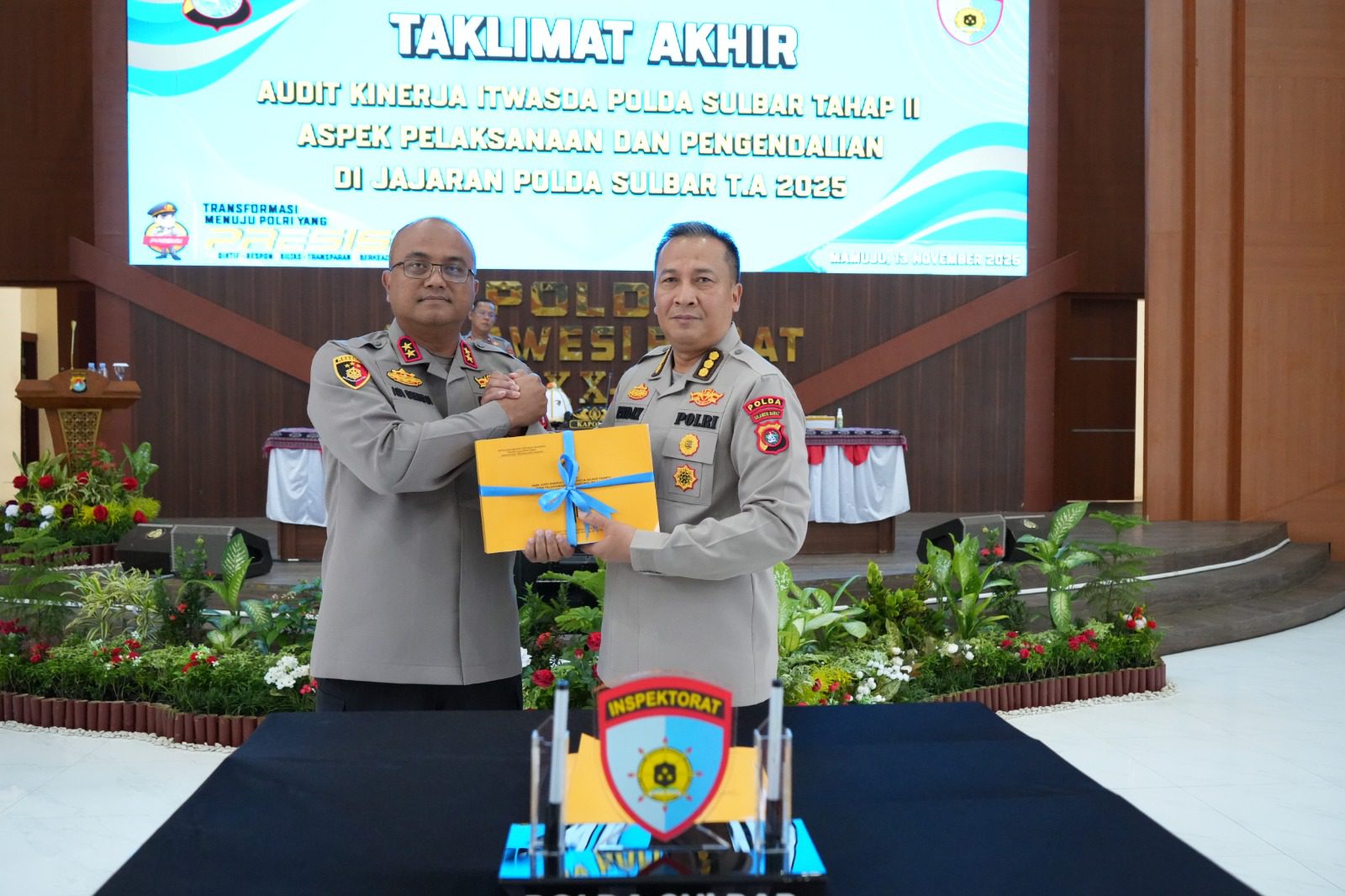 Polda Sulbar ambarnews.com – Kapolda Sulawesi Barat, Irjen Pol. Adi Deriyan Jayamarta, secara resmi menutup kegiatan audit kinerja tahap II Itwasda Polda Sulbar T.A. 2025, yang meliputi aspek pelaksanaan dan pengendalian pada seluruh satuan kerja (satker) dan satuan wilayah (satwil) jajaran Polda Sulbar, Kamis (13/11/25) di Aula Marannu Mapolda.