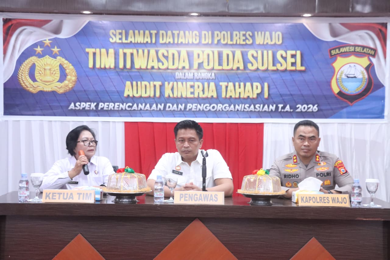 WAJO–AMBARNEWS.COM || Kapolres Wajo AKBP Muhammad Rosid Ridho, S.I.K menerima kunjungan Tim Audit Kinerja Inspektorat Pengawasan Daerah (Itwasda) Polda Sulawesi Selatan dalam rangka Audit Kinerja Tahap I Tahun Anggaran 2026. Kegiatan ini berlangsung di Aula Sandi Mapolres Wajo, Rabu (15/4/2026) pukul 09.00 Wita.