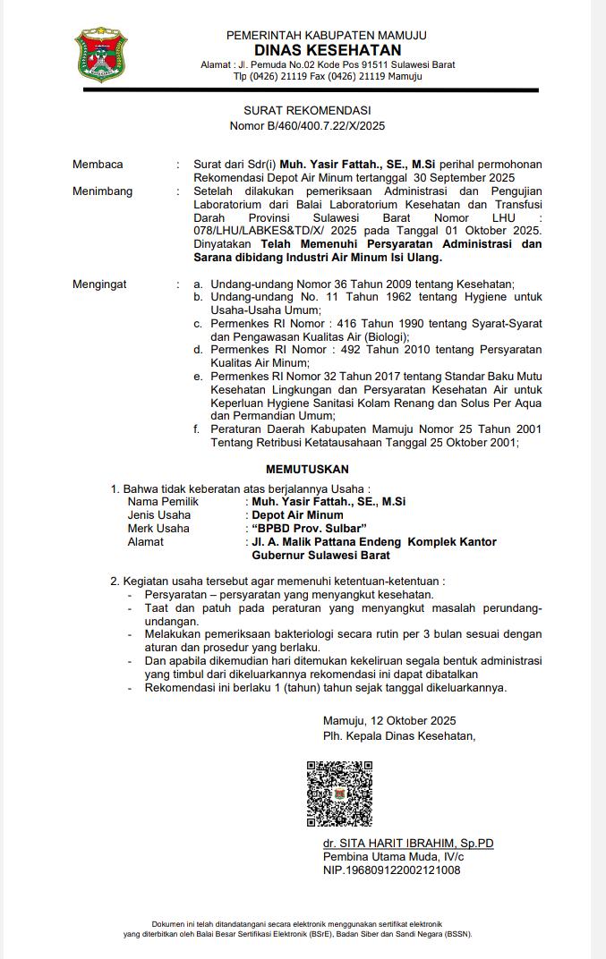 “Dengan terbitnya surat rekomendasi ini, kendaraan Water Treatment BPBD Sulbar resmi dapat beroperasi dan siap digunakan untuk kebutuhan pelayanan kemanusiaan di lapangan. Ini adalah bentuk komitmen kami untuk terus meningkatkan kesiapsiagaan dan pelayanan kepada masyarakat,” ujar Yasir Fattah, Rabu 15 Oktober 2025.