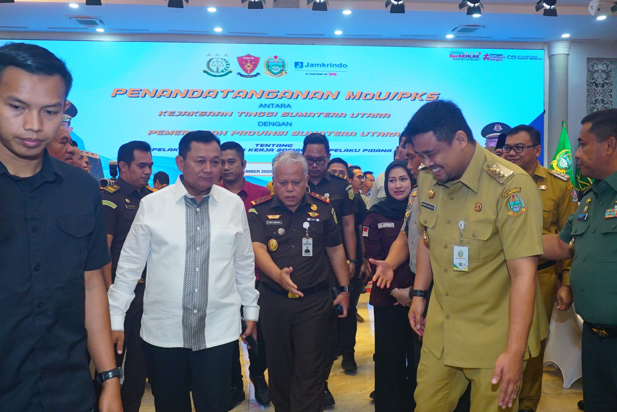 Kegiatan yang berlangsung di aula Raja Inal Siregar kantor Gubernur Provinsi Sumatera Utara Jalan Pangeran Diponegoro Medan, Selasa (18/11/2025) dihadiri Gubernur Sumut Bobby Nasution, Kajati Sumut Dr.Harli Siregar, SH.,M.Hum, Ketua DPRD Sumut Wakil Gubernur Sumut, Sekretaris Daerah Sumut, Wakapolda Sumut, Kasdam 1/BB, Danlanud Soewondo, Kabinda Sumut, Komando Daerah Angkatan Laut (Kodaeral), Para Asisten, Para Kajari, Kabag TU dan Koordinator, para Bupati/Walikota se Provinsi Sumatera Utara, pimpinan dan Jajaran Jamkrindo se-Sumatera Utara serta para Kepala OPD Provinsi Sumatera Utara.