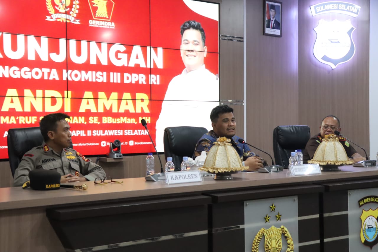 SOPPENG-AMBARNEWS.COM || Polres Soppeng menerima kunjungan kerja Anggota Komisi III DPR RI Andi Ma’ruf Sulaiman, SE, BBusMan, MH. dalam rangka reses ke-5 DPR RI di daerah pemilihan Sulawesi Selatan. Kegiatan berlangsung di Aula Tantya Sudhirajati Polres Soppeng, Jalan Latenri Bali, Kelurahan Lalabatarilau, Kecamatan Lalabata, Kabupaten Soppeng. Rabu, 22 Oktober 2025.