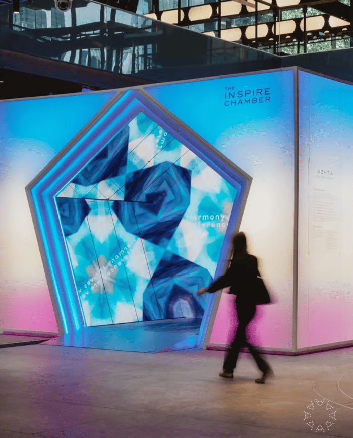 Instalasi seni utama yang berlokasi di SCBD Lobby ini merupakan interpretasi visual dari perjalanan lima tahun ASHTA. Dirancang sebagai ruang interaktif yang imersif, The Inspire Chamber menggunakan perpaduan dinamis dari cahaya, warna, dan pantulan. Konsepnya berakar pada filosofi bahwa sebuah ide atau momen inspirasi sekecil apa pun memiliki potensi untuk berkembang menjadi sesuatu yang monumental. Instalasi ini mengajak pengunjung untuk melepaskan batasan imajinasi mereka.