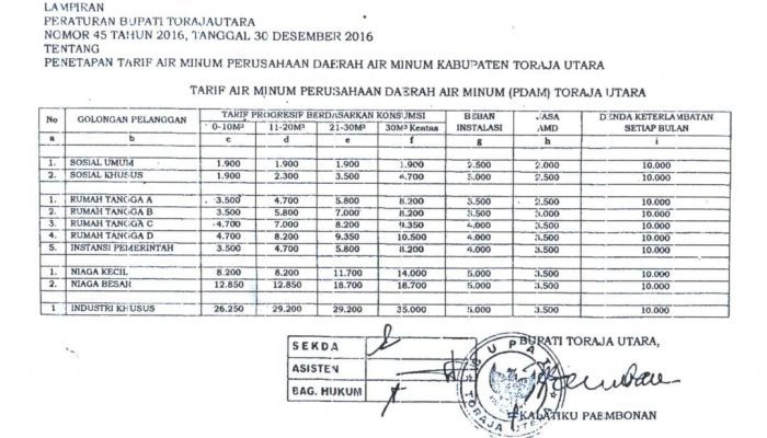 Untuk diketahui tarif PDAM Torut yakni, Golongan pelanggan Sosial umum untuk tarif 0-10M kubik rp1900, 11-20 M kubik Rp1900, 21-30M kubik rp1900, 30 meter kubik 1900, beban instalasi rp2500 dan beban AMD Rp2000 serta Denda keterlambatan per bulan Rp10 ribu.