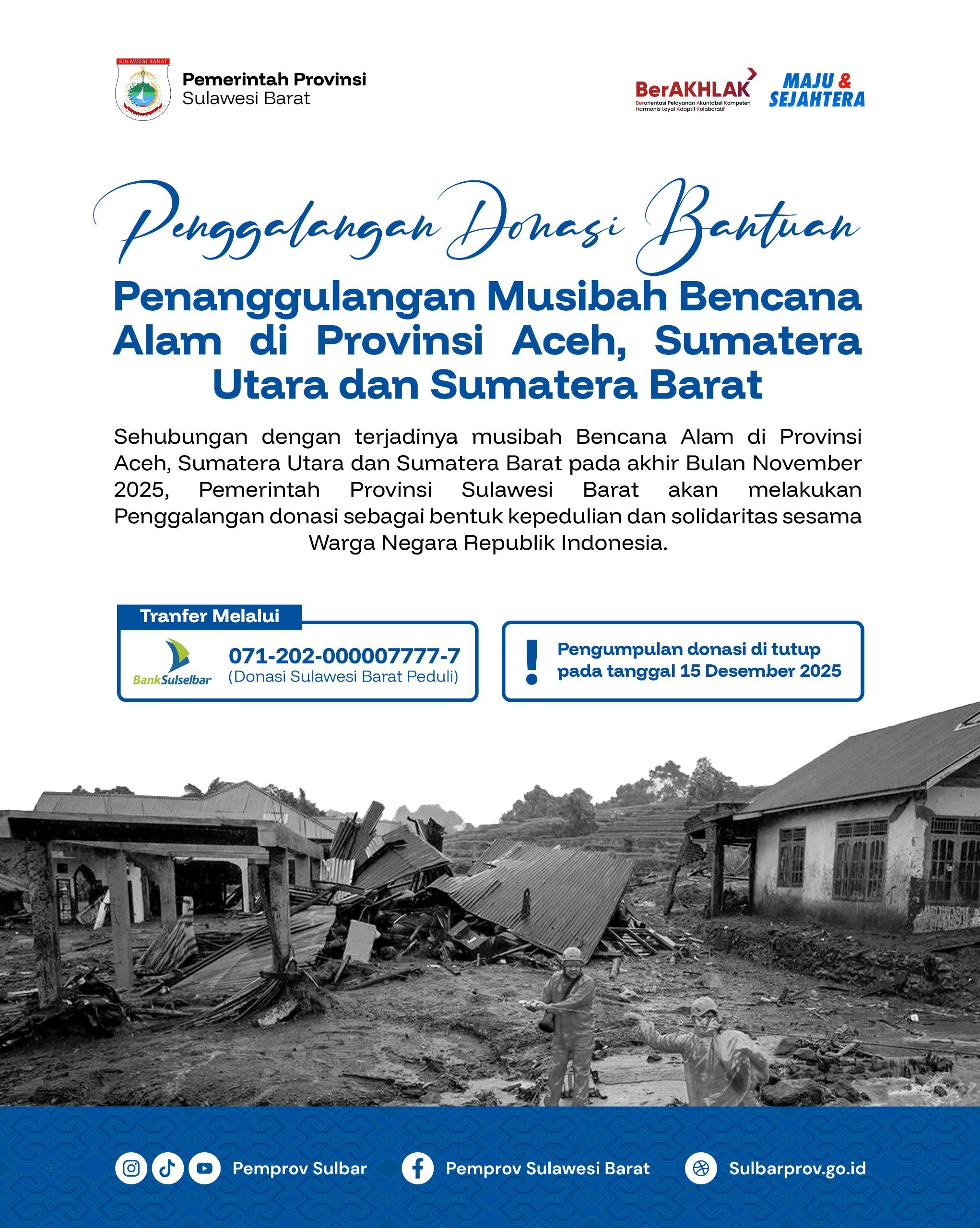 Mamuju ambarnews.com– Pemerintah Provinsi Sulawesi Barat resmi mengumumkan penggalangan donasi untuk membantu penanggulangan musibah bencana alam yang melanda sejumlah wilayah di Provinsi Aceh, Sumatera Utara, dan Sumatera Barat pada akhir November 2025, , 4 Desember 2025.