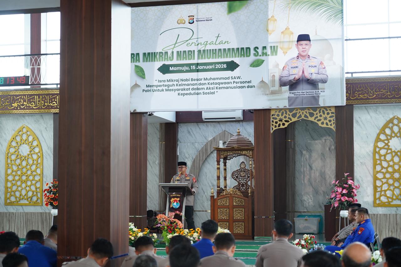Polda Sulbar ambarnews .com-– Peringatan Isra Mikraj Nabi Muhammad Shallallahu Alaihi wa Sallam juga meriahkan lingkungan Polda Sulbar. Di Masjid Jabal Rahmah, Kamis (15/1/26), Kapolda Sulbar Irjen Pol Adi Deriyan Jayamarta bersama pejabat utama, serta seluruh personel muslim dan muslimah mengikuti rangkaian kegiatan ibadah dengan khidmat.