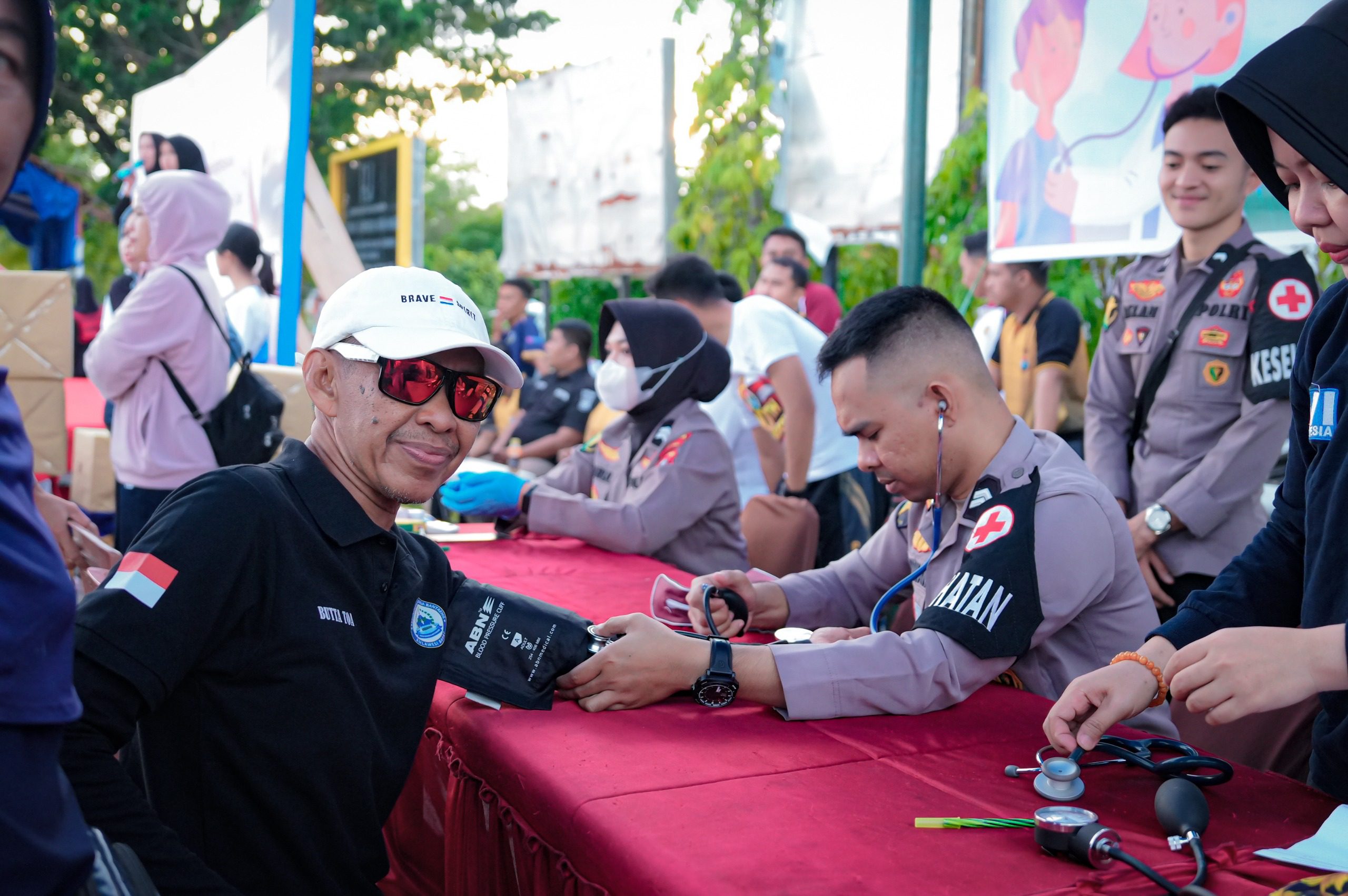 Petugas dari Bidang Kesehatan (Dokkes) Polri bersiaga penuh memberikan layanan pemeriksaan kesehatan gratis bagi masyarakat yang hadir. Layanan ini disambut antusias warga yang ingin memantau kondisi kesehatan mereka secara rutin.