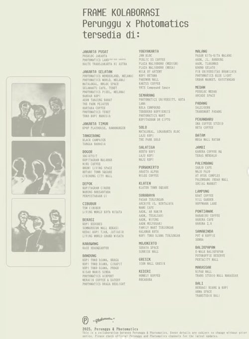 Kolaborasi Framenya x Perunggu sudah tersedia di seluruh cabang Photomatics mulai [15/08/2025].