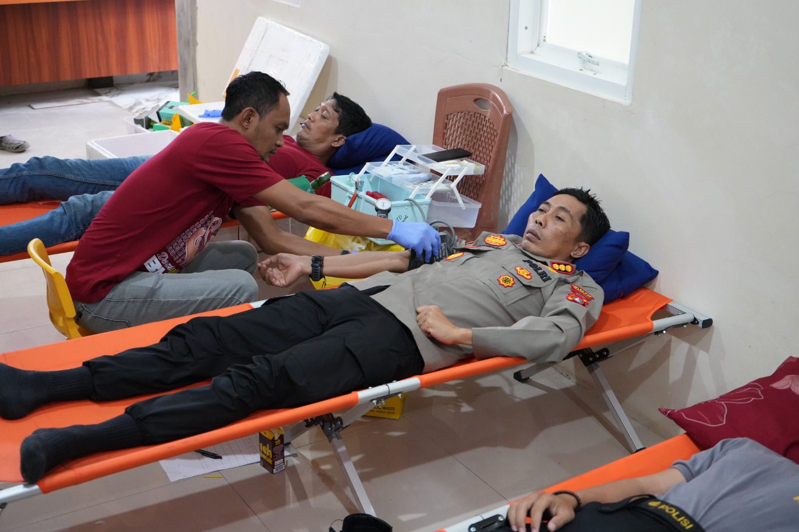 Aula Dokpol Rumah Sakit Bhayangkara terlihat ramai dipadati oleh personel Polda Sulbar yang antusias mendonorkan darahnya. Wakapolda Sulbar, Brigjen Pol Hari Santoso, bersama dengan para pejabat utama Polda Sulbar, turut hadir dan berpartisipasi langsung dalam kegiatan donor darah ini sebagai bentuk dukungan dan motivasi bagi personel lainnya.