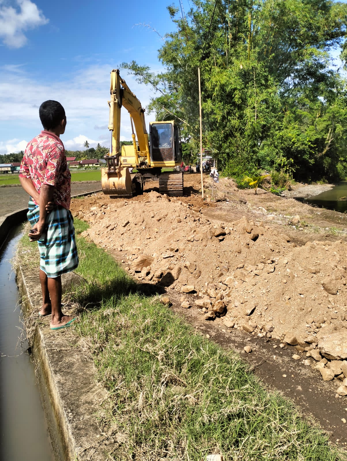 Setelah sebelumnya menyelesaikan perbaikan tanggul yang rusak akibat abrasi, tim dari Dinas Pekerjaan Umum dan Penataan Ruang (PUPR) Soppeng langsung mengarahkan satu unit ekskavator untuk menimbun dan memperbaiki akses jalan utama yang nyaris terputus.