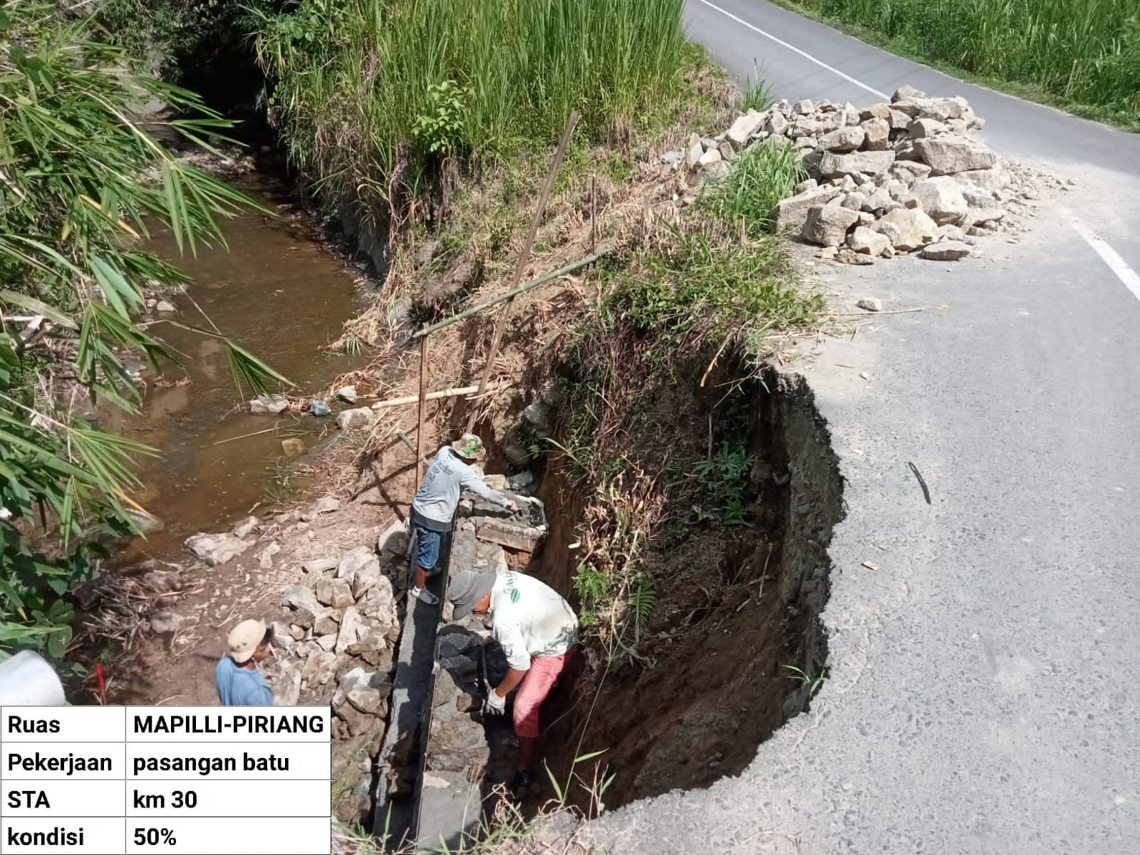 Menindaklanjuti kondisi tersebut, Dinas Pekerjaan Umum dan Penataan Ruang (PUPR) Provinsi Sulawesi Barat (Sulbar) melalui Unit Pelaksana Teknis Daerah (UPTD) Pemeliharaan Jalan dan Jembatan turun ke lokasi untuk melakukan penanganan darurat.