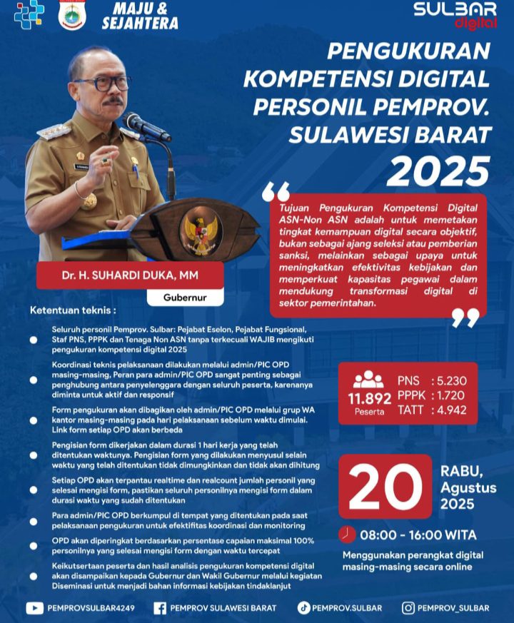 Mamuju ambarnews.com– Pemerintah Provinsi Sulawesi Barat akan melaksanakan Pengukuran Kompetensi Digital Personil Pemprov Sulbar Tahun 2025 pada Rabu, 20 Agustus 2025,