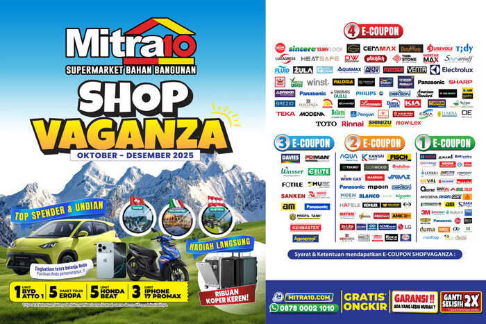 Dengan begitu, pelanggan bisa berbelanja lebih hemat sekaligus memastikan rumah makin nyaman. Itulah mengapa Shopvaganza 2025 sejalan dengan tagline Mitra10: #SelengkapItu untuk wujudkan hunian impian jadi #RumahNyaman.