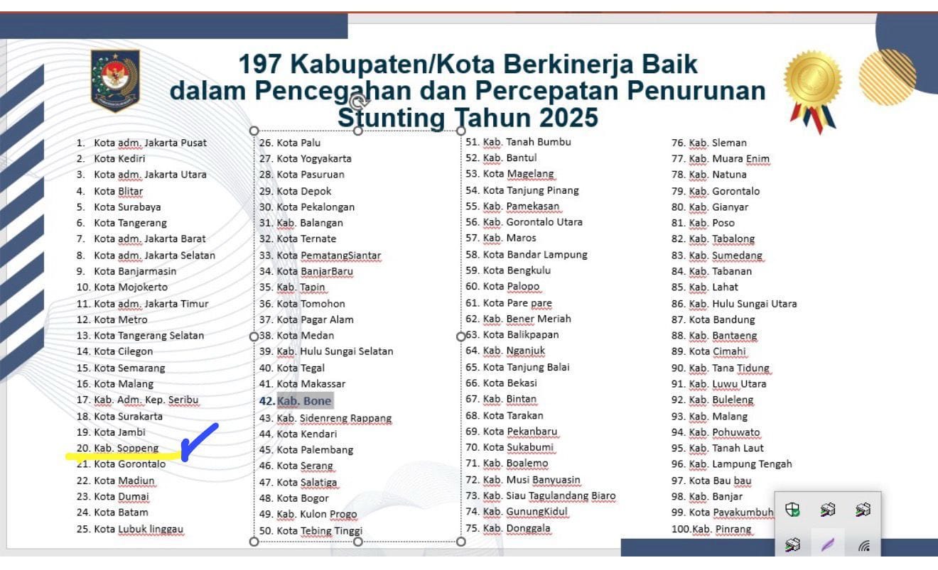 Prestasi ini menempatkan Soppeng sejajar dengan daerah-daerah berprestasi lainnya seperti Kota Kediri, Jakarta, dan Kota Tangerang yang juga tercatat memiliki kinerja unggul dalam percepatan penurunan stunting tahun 2025. Dalam daftar nasional, Kabupaten Soppeng berada pada posisi ke-20, sebuah capaian yang dinilai sangat membanggakan.