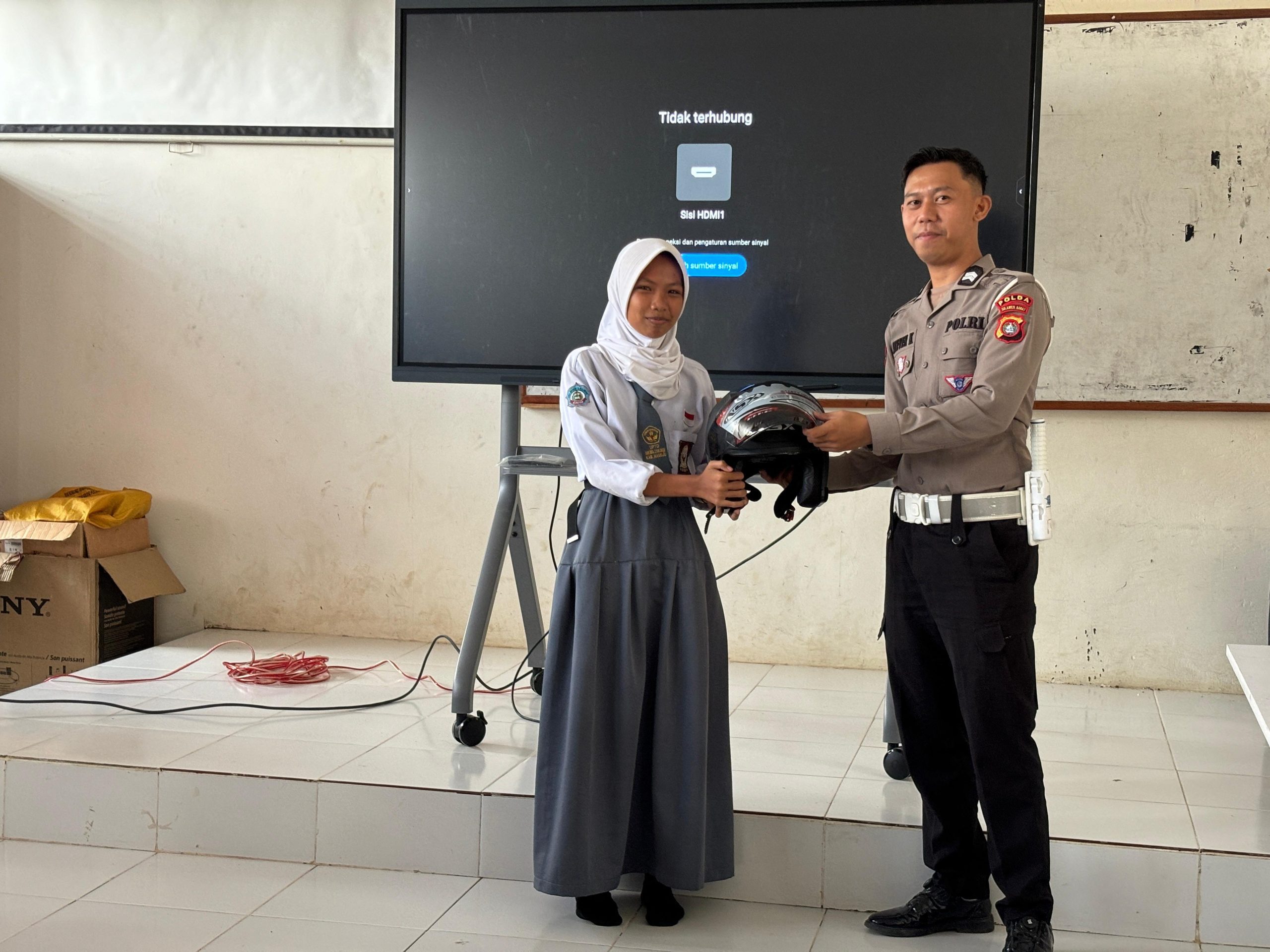 Tak hanya memberikan materi edukatif, pihak penyelenggara juga memberikan bantuan berupa helm SNI standar nasional beserta cenderamata berupa stiker keselamatan lalu lintas kepada siswa dan guru yang terpilih.
