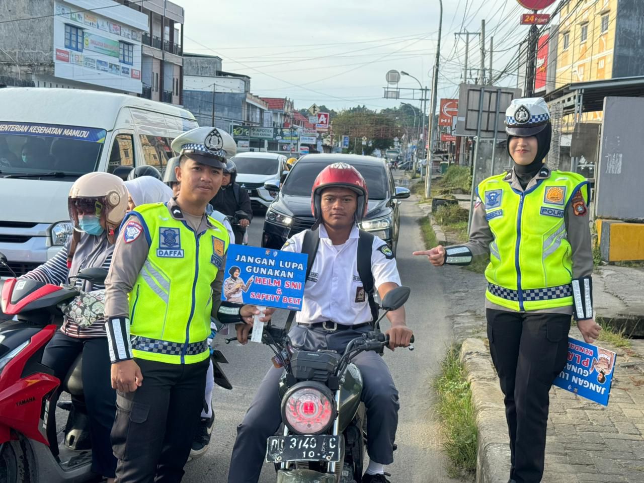 Tak hanya itu, personel juga menekankan pentingnya penggunaan helm yang telah bersertifikasi SNI untuk pengendara sepeda motor, serta pemakaian sabuk pengaman bagi pengendara dan penumpang kendaraan bermotor roda empat. Selain itu, juga diingatkan agar setiap kendaraan selalu memasang plat nomor yang sah dan membawa kelengkapan surat-surat kendaraan seperti STNK dan SIM yang masih berlaku.