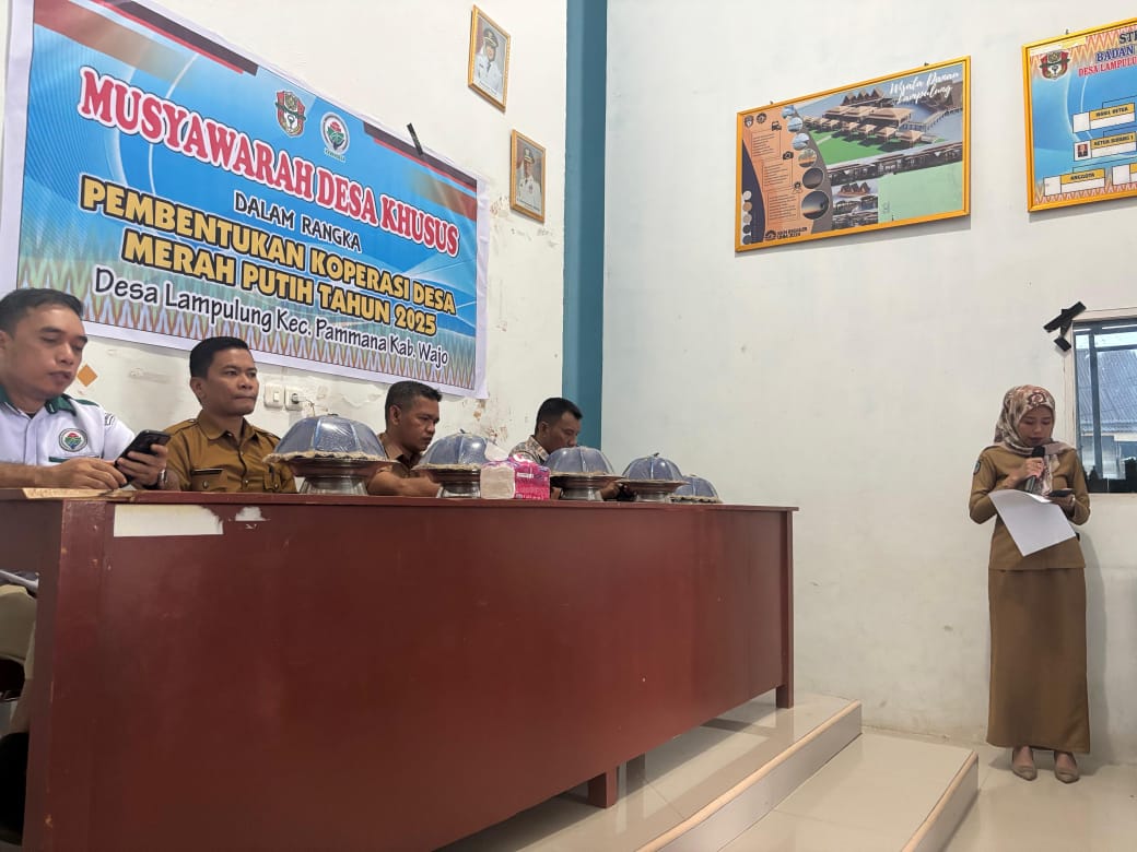 Wajo, ambarnews.comDalam upaya meningkatkan perekonomian masyarakat desa, warga Desa Lampulung resmi membentuk Koperasi Merah Putih pada hari Selasa, 20 Mei 2025. Pembentukan koperasi ini berlangsung di kantor Desa Lampulung kabupaten Wajo dan dihadiri oleh Kepala desa, perangkat desa, tokoh masyarakat, pendamping desa, serta perwakilan dari Dinas Koperasi dan UMKM Kabupaten dan berbagai elemen masyarakat lainnya.